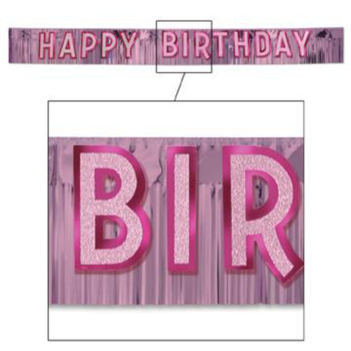 Add a touch of glamour to your birthday celebration with the "Pink Metallic Happy Birthday Fringe Banner." Measuring 10 inches by 9 fee...